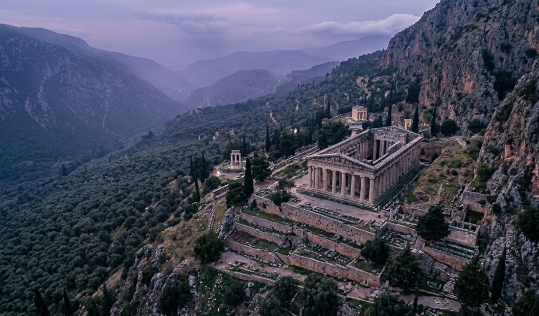אנחנו מטפסים על הר פארנאסוס, גבוה מעל מטעי זיתים אינסופיים. האוויר הופך קריר יותר והנוף נפתח למעמקים עוצרי נשימה. כאן שוכן מקדש דלפי. עבור היוונים הקדמונים, זה היה האומפאלוס (Omphalos) – ה"טבור" של העולם, המקום המדויק שבו נפגשו שני הנשרים ששלח זאוס משני קצוות היקום כדי למצוא את המרכז.